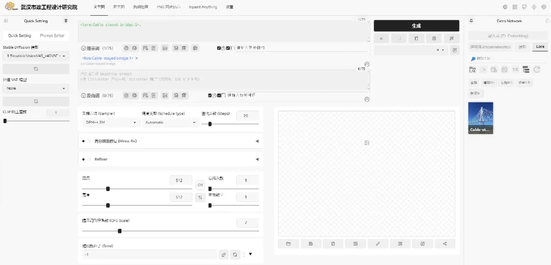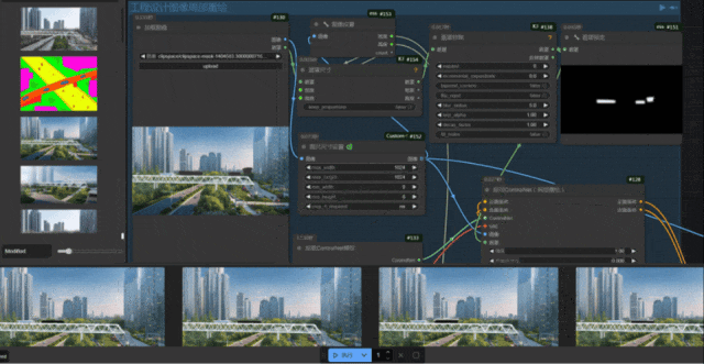 ? ? 武漢市政院在 AIGC 生成效果圖方案領(lǐng)域,通過(guò)深度學(xué)習(xí)算法優(yōu)化與專業(yè)圖像數(shù)據(jù)訓(xùn)練,搭建了市政工程效果圖方案自動(dòng)化生成平臺(tái)1.0版,構(gòu)建了路橋、建筑等專業(yè)圖像生成大模型的模型庫(kù)。平臺(tái)通過(guò)引入DeepSeek-R1 等前沿大語(yǔ)言模型,借助其強(qiáng)大的深度語(yǔ)義理解機(jī)制與多模態(tài)認(rèn)知能力,可解構(gòu)模糊設(shè)計(jì)意圖,自動(dòng)生成符合工程規(guī)范與藝術(shù)審美的精準(zhǔn)提示詞,突破傳統(tǒng)人工描述的主觀性與局限性;同時(shí),依托自定義節(jié)點(diǎn)技術(shù),成功開發(fā)并驗(yàn)證了多套一鍵生成效果圖的高效工作流,為設(shè)計(jì)團(tuán)隊(duì)提供了豐富的靈感和多元化的選擇。