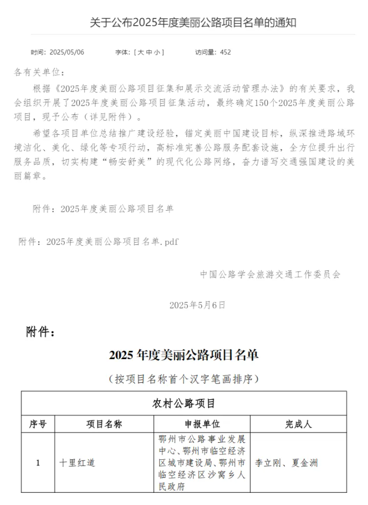 ? ? 近日,中國公路學(xué)會正式公布“2025年度美麗公路項目”名單,武漢市政院設(shè)計的鄂州市臨空經(jīng)濟區(qū)沙窩鄉(xiāng)“十里紅道”憑借紅色文化傳承與生態(tài)環(huán)境融合的卓越理念,成功躋身全國150個標桿項目之列。