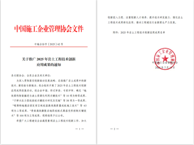 ? ? 近日,中國施工企業(yè)管理協(xié)會(huì)2025年巖土工程技術(shù)創(chuàng)新應(yīng)用成果結(jié)果正式揭曉。經(jīng)過企業(yè)申報(bào)、形式審查、專家評審等多個(gè)環(huán)節(jié)遴選,武漢市政院巖土博士創(chuàng)新工作室申報(bào)的“深厚富水圓礫層基坑地下水控制特種技術(shù)”、“敏感環(huán)境地鐵盾構(gòu)隧道穿越極硬巖特種技術(shù)”等2項(xiàng)技術(shù)創(chuàng)新性顯著,獲評為三等成果。