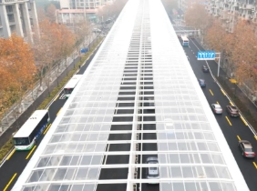 ? ? 項(xiàng)目設(shè)計(jì)團(tuán)隊(duì)始終秉持 “輕量化、智能化、綠色化” 理念,多項(xiàng)技術(shù)應(yīng)用填補(bǔ)區(qū)域空白,樹立行業(yè)新標(biāo)桿。在鋪裝材料與工藝上,主線高架鋼箱梁橋面采用澆注式瀝青鋪裝,相比傳統(tǒng)方案減重16%,既降低橋梁結(jié)構(gòu)負(fù)荷、提升安全性,又縮短施工周期;鋼箱梁采用U肋全熔透智能焊接,大幅提高結(jié)構(gòu)疲勞壽命,積極推進(jìn)鋼箱梁U肋焊接工藝的發(fā)展。尤為引人注目的是,本項(xiàng)目集中展現(xiàn)了三大創(chuàng)新亮點(diǎn):它擁有全國(guó)最長(zhǎng)的連續(xù)全封閉聲屏障,是湖北省首例“光伏+市政”的融合實(shí)踐,更在武漢率先實(shí)現(xiàn)了聲屏障光伏發(fā)電的應(yīng)用,為綠色市政建設(shè)樹立了新的樣板。