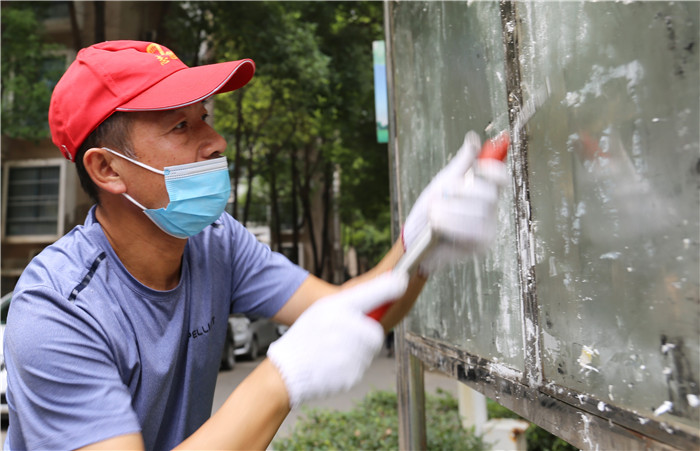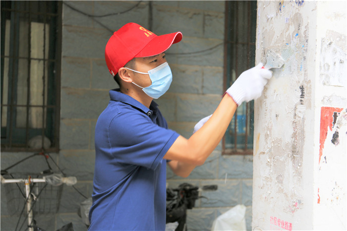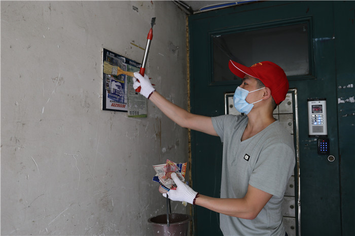 由于該小區(qū)系老舊小區(qū),樓棟內(nèi)沒有電梯,黨員們需要步行逐層進(jìn)行清理,加之暑熱未消,沒過一會他們的衣服就被汗水浸濕了,額頭上也掛滿了密密的汗珠。但看著煥然一新的房門和墻面,他們的心里也油然生出了滿滿的成就感。