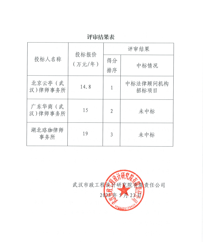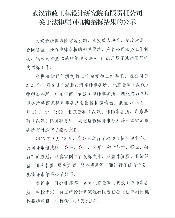 武漢市政工程設(shè)計研究院有限責(zé)任公司關(guān)于法律顧問機(jī)構(gòu)招標(biāo)結(jié)果的公示